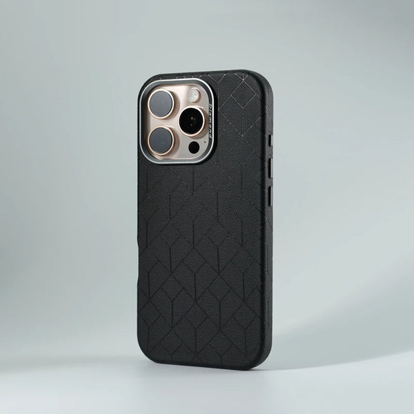 Geometric Lattices Relief Leather MagSafe Alloy Lens Phone Case For iPhone
