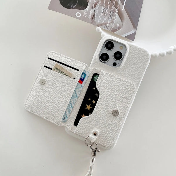 Litchi Patterned Wallet Phone Case with Wrist Strap for iPhone